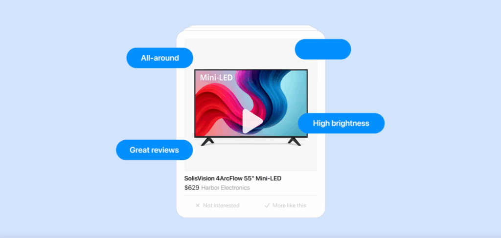 Then, using your input, it searches across the internet to find up-to-date recommendations that fit your request. You can select “not interested” or “more like this” on each product to help personalize the selections further.